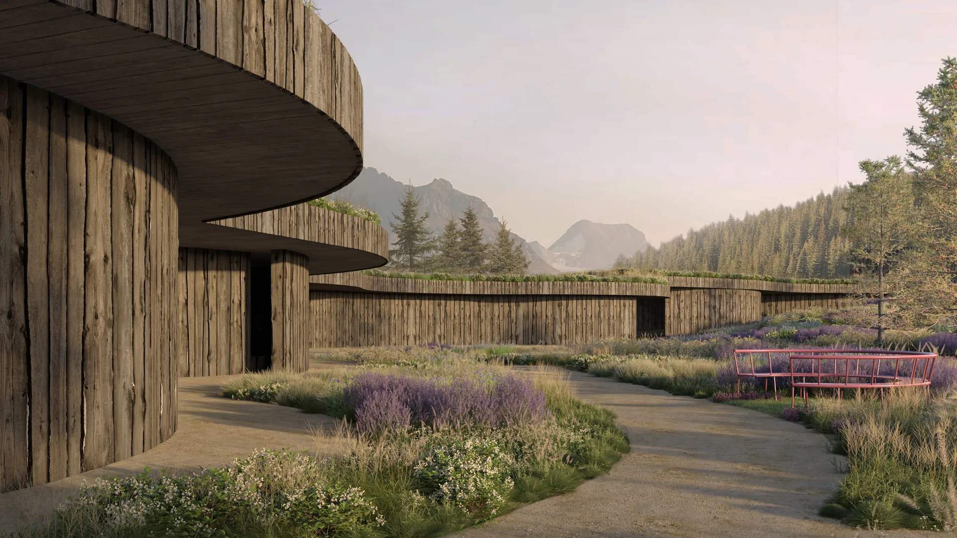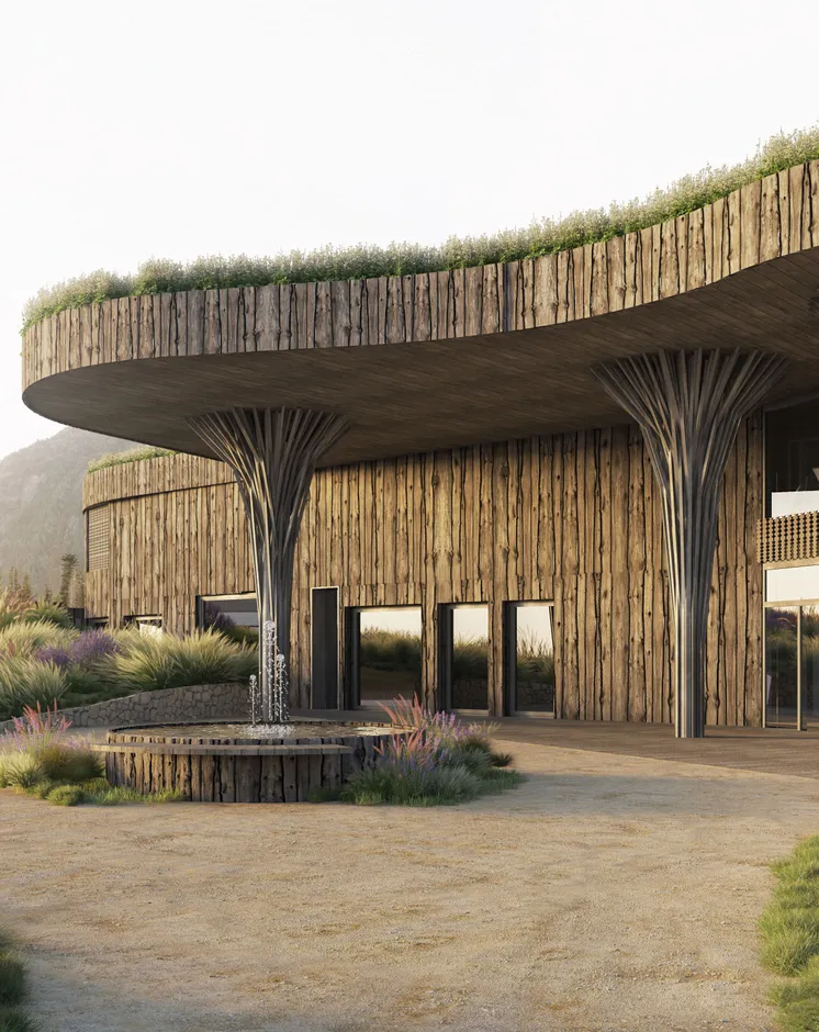 Organische Formen tanzen im Takt der Natur. Architektur, die Systeme entlastet. LaPosch – Living Lands als renaturierter Raum, gewachsen aus der Landschaft. Geschwungene Linien führen weich durch Wege und Räume, begrünte Dächer schreiben die Topografie fort. Wasserläufe legen Ruhe über den Tag, kleine Strukturen schaffen Nähe und Abstand zugleich. Die Landschaft wirkt mit, ordnet und trägt. Ruhe entsteht durch Gestaltung – durch Proportion, Material und Rhythmus.